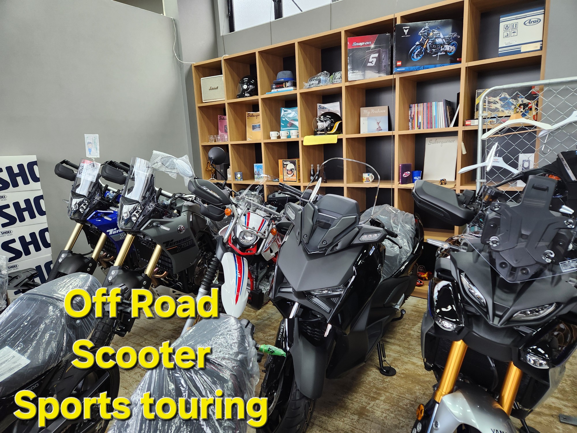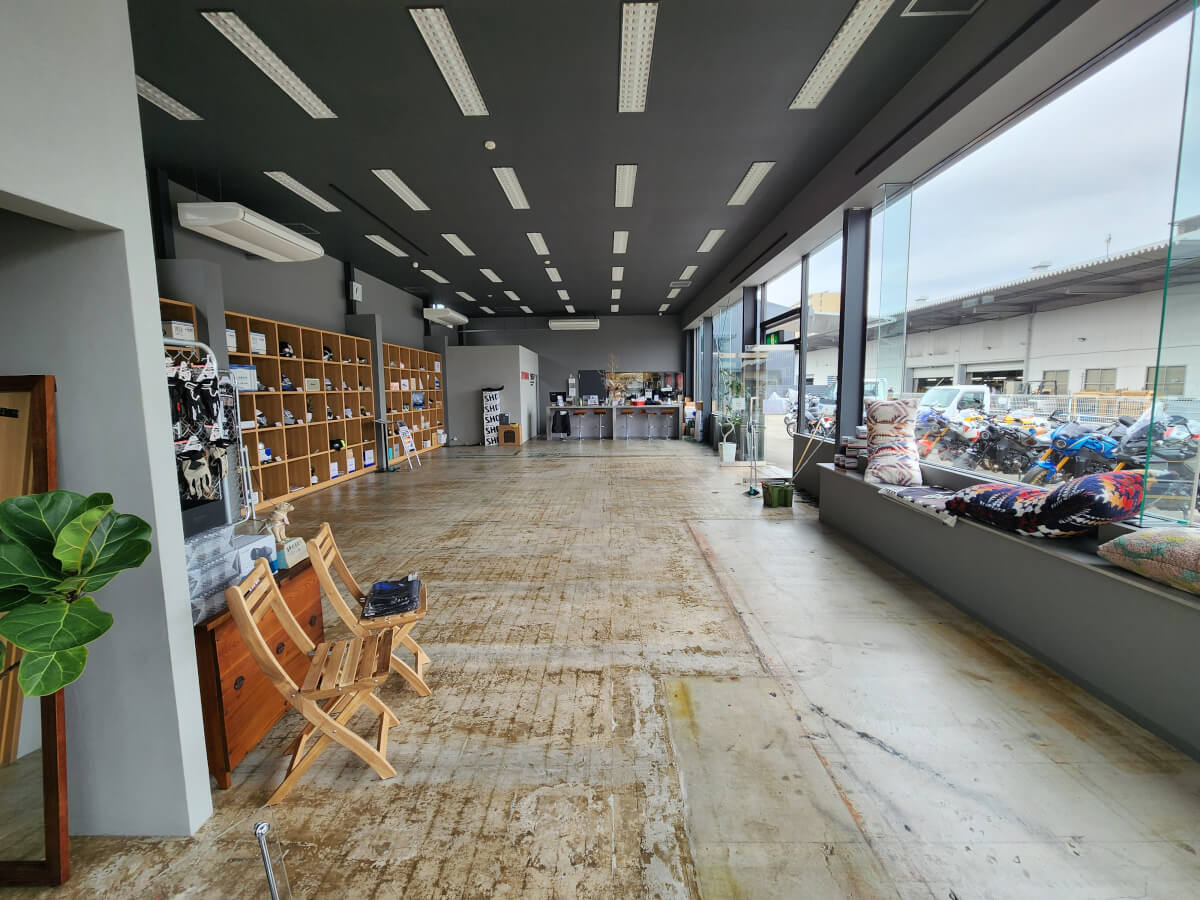 でも実は本来の思惑とは裏腹なんです。この感じ。元のコンセプトはスタイリッシュでポツン・ポツンとバイクを並べて外車ディーラーみたいにしたいとは思ってるんですがなかなかですね・・・