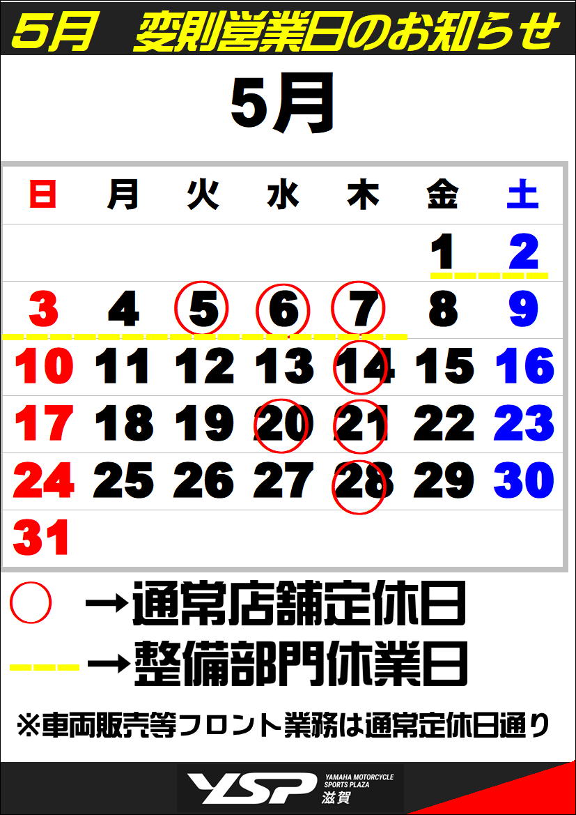 5月の営業日、整備部門休業日について