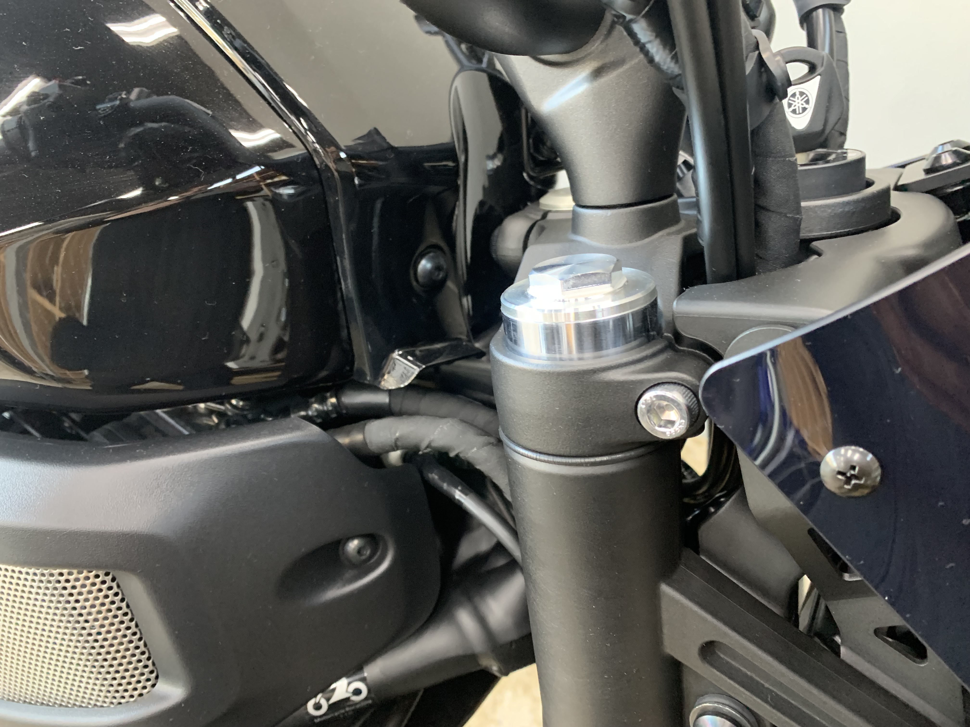 XSR700をローダウン。 RPM製ローダウンサスペンション装着で足つき向上。 サスペンションとしての性能ももちろん向上。 ・ ローダウンサスペンション装着に伴いフロントフォーク突き出し調整。 オプションのメーターバイザーも装着しています。